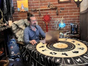 His class is perfect if you want to get beyond the 12 sun signs and read a whole birth chart—use astrology for divination, yes you can—if you want to get a new perspective on tarot, on earth-based calendars, on astronomy and cosmic philosophy. Learn how to follow the real planets moving in the sky—or all of the above.